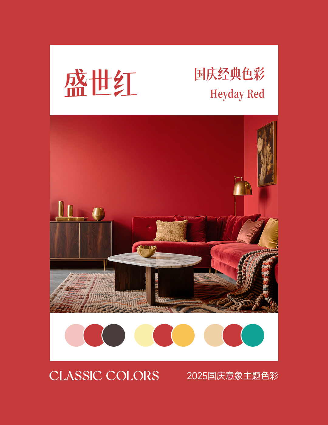 In practical application, we recommend following the "70/25/05" color matching principle: 70% of the main colors, 25% of the auxiliary colors, and 5% of the decorative colors. Although the theme color of National Day is beautiful, it should be used appropriately. Large areas of bright colors are easy to cause visual fatigue. We recommend that the theme color be used for key walls, and neutral color be selected for balance for other walls.